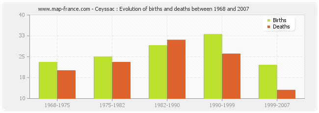 Ceyssac : evolution of births and deaths from 1968 to 2007