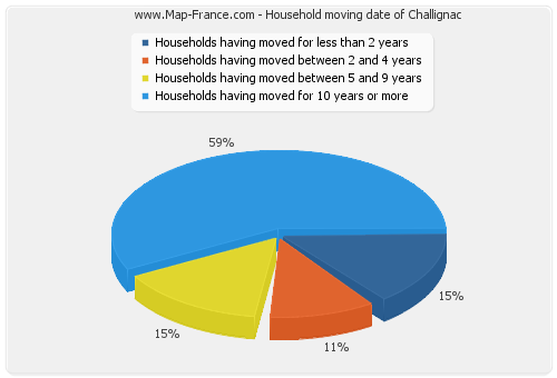 - Number of households of Challignac having moved between 2 and 5 years : 13 - Number of households of Challignac having moved between 5 and 9 years : 18 - Number of households of Challignac having moved for 10 years or more : 71 |