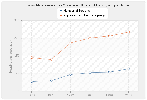 The population of Chambeire was 251 inhabitants in 2007, 234 inhabitants in 1999, 225 inhabitants in 1990, 205 inhabitants in 1982, 134 inhabitants in 1975 and 143 inhabitants in 1968. Meanwhile, the number of housing of Chambeire was 95 in 2007, 81 in 1999, 79 in 1990, 71 in 1982, 45 in 1975 and 41 in 1968.