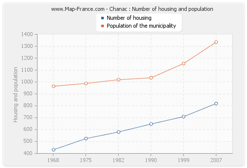 The population of Chanac was 1 335 inhabitants in 2007, 1 155 inhabitants in 1999, 1 035 inhabitants in 1990, 1 019 inhabitants in 1982, 988 inhabitants in 1975 and 964 inhabitants in 1968. Meanwhile, the number of housing of Chanac was 819 in 2007, 709 in 1999, 647 in 1990, 580 in 1982, 525 in 1975 and 431 in 1968.