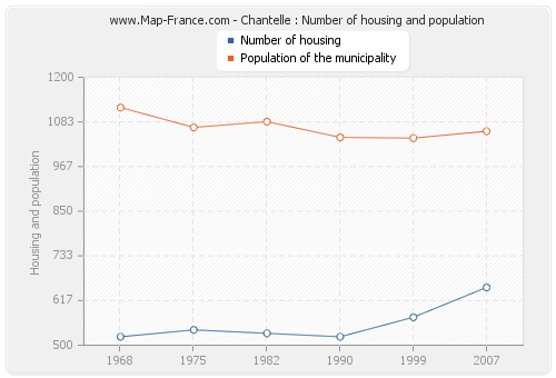 The population of Chantelle was 1 059 inhabitants in 2007, 1 041 inhabitants in 1999, 1 043 inhabitants in 1990, 1 084 inhabitants in 1982, 1 069 inhabitants in 1975 and 1 121 inhabitants in 1968. Meanwhile, the number of housing of Chantelle was 651 in 2007, 573 in 1999, 522 in 1990, 531 in 1982, 540 in 1975 and 522 in 1968.
