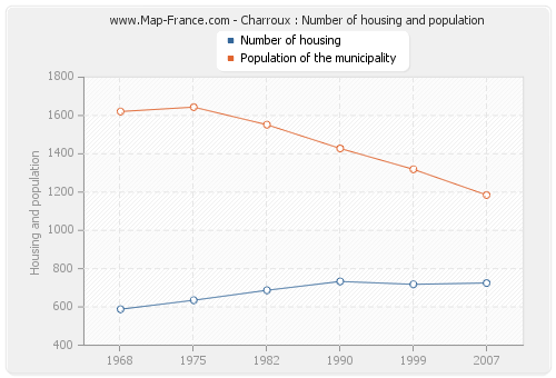 The population of Charroux was 1 185 inhabitants in 2007, 1 319 inhabitants in 1999, 1 428 inhabitants in 1990, 1 552 inhabitants in 1982, 1 644 inhabitants in 1975 and 1 621 inhabitants in 1968. Meanwhile, the number of housing of Charroux was 725 in 2007, 718 in 1999, 733 in 1990, 687 in 1982, 635 in 1975 and 588 in 1968.