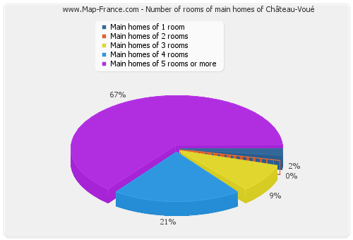 - Number of main homes of Château-Voué of 1 room : 1 - Number of main homes of Château-Voué of 2 rooms : 0 - Number of main homes of Château-Voué of 3 rooms : 4 - Number of main homes of Château-Voué of 4 rooms : 4 - Number of main homes of Château-Voué of 5 rooms and more : 29 |