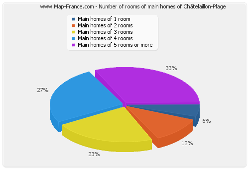 - Number of main homes of Châtelaillon-Plage of 1 room : 161 - Number of main homes of Châtelaillon-Plage of 2 rooms : 344 - Number of main homes of Châtelaillon-Plage of 3 rooms : 682 - Number of main homes of Châtelaillon-Plage of 4 rooms : 682 - Number of main homes of Châtelaillon-Plage of 5 rooms and more : 950 |