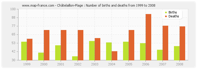 - Châtelaillon-Plage in 2008 : 49 births and 76 deaths