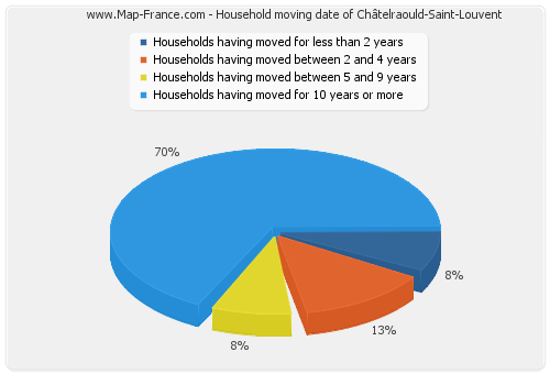 - Number of households of Châtelraould-Saint-Louvent having moved between 2 and 5 years : 13 - Number of households of Châtelraould-Saint-Louvent having moved between 5 and 9 years : 8 - Number of households of Châtelraould-Saint-Louvent having moved for 10 years or more : 68 |