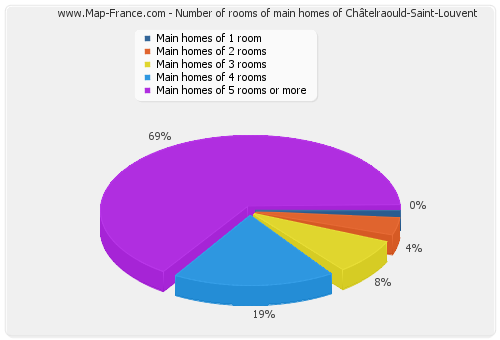 - Number of main homes of Châtelraould-Saint-Louvent of 1 room : 0 - Number of main homes of Châtelraould-Saint-Louvent of 2 rooms : 4 - Number of main homes of Châtelraould-Saint-Louvent of 3 rooms : 8 - Number of main homes of Châtelraould-Saint-Louvent of 4 rooms : 8 - Number of main homes of Châtelraould-Saint-Louvent of 5 rooms and more : 66 |