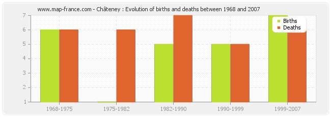 Population of Châteney was 54 inhabitants in 2007, 45 inhabitants in 1999, 46 inhabitants in 1990, 40 inhabitants in 1982, 44 inhabitants in 1975 and 60 inhabitants in 1968.