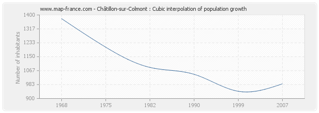 This curve shows the history of the population of Châtillon-sur-Colmont from 1968 to 2007 in cubic interpolation. This provides more precisely the population of the municipality of Châtillon-sur-Colmont the years where no census has been taken.