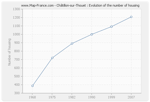 The number of housing of Châtillon-sur-Thouet was 1 208 in 2007, 1 092 in 1999, 1 000 in 1990, 891 in 1982, 720 in 1975 and 387 in 1968.