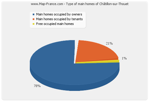 - Number of main homes of Châtillon-sur-Thouet occupied by owners : 914 - Number of main homes of Châtillon-sur-Thouet occupied by tenants : 245 - Number of main homes of Châtillon-sur-Thouet occupied free of charge : 7 |