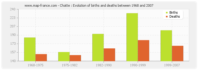 Chatte : evolution of births and deaths from 1968 to 2007