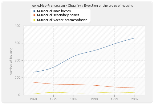 The following graphs show the history of the number and the type of housing of Chauffry from 1968 to 2007. The second graph is drawn in cubic interpolation. This allows to obtain more exactly the number of accommodation of the town of Chauffry years where no inventory was made.