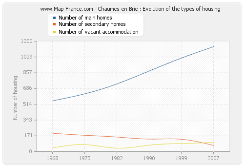 The number of housing of Chaumes-en-Brie was 1 308 in 2007, 1 239 in 1999, 1 083 in 1990, 932 in 1982, 882 in 1975 and 792 in 1968.