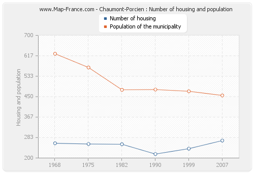 The population of Chaumont-Porcien was 455 inhabitants in 2007, 472 inhabitants in 1999, 479 inhabitants in 1990, 478 inhabitants in 1982, 569 inhabitants in 1975 and 625 inhabitants in 1968. Meanwhile, the number of housing of Chaumont-Porcien was 271 in 2007, 238 in 1999, 216 in 1990, 256 in 1982, 257 in 1975 and 260 in 1968.