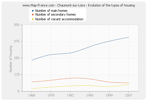 The following graphs show the history of the number and the type of housing of Chaumont-sur-Loire from 1968 to 2007. The second graph is drawn in cubic interpolation. This allows to obtain more exactly the number of accommodation of the town of Chaumont-sur-Loire years where no inventory was made.