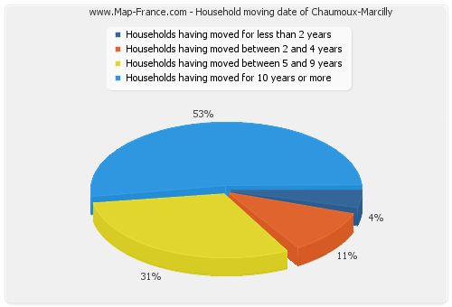 - Number of households of Chaumoux-Marcilly having moved between 2 and 5 years : 5 - Number of households of Chaumoux-Marcilly having moved between 5 and 9 years : 14 - Number of households of Chaumoux-Marcilly having moved for 10 years or more : 24 |