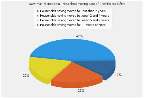 - Number of households of Chemillé-sur-Dême having moved between 2 and 5 years : 64 - Number of households of Chemillé-sur-Dême having moved between 5 and 9 years : 58 - Number of households of Chemillé-sur-Dême having moved for 10 years or more : 140 |
