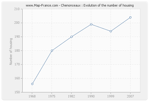 The number of housing of Chenonceaux was 204 in 2007, 194 in 1999, 199 in 1990, 190 in 1982, 180 in 1975 and 156 in 1968.
