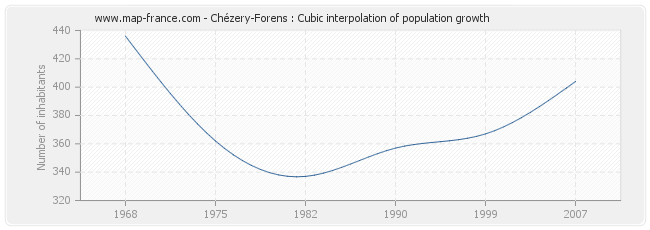 Population of Chézery-Forens was 404 inhabitants in 2007, 367 inhabitants in 1999, 357 inhabitants in 1990, 337 inhabitants in 1982, 362 inhabitants in 1975 and 436 inhabitants in 1968.