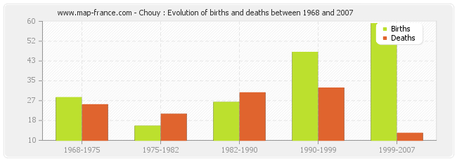 Population of Chouy was 377 inhabitants in 2007, 318 inhabitants in 1999, 269 inhabitants in 1990, 239 inhabitants in 1982, 278 inhabitants in 1975 and 306 inhabitants in 1968.
