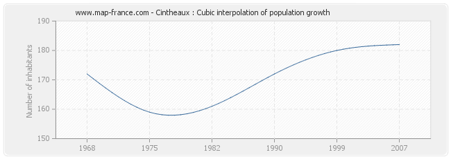 This curve shows the history of the population of Cintheaux from 1968 to 2007 in cubic interpolation. This provides more precisely the population of the municipality of Cintheaux the years where no census has been taken.