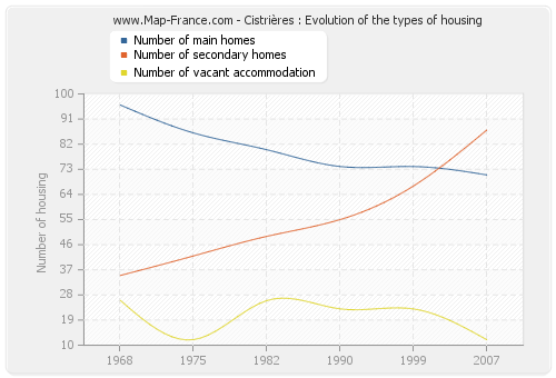 The following graphs show the history of the number and the type of housing of Cistrières from 1968 to 2007. The second graph is drawn in cubic interpolation. This allows to obtain more exactly the number of accommodation of the town of Cistrières years where no inventory was made.