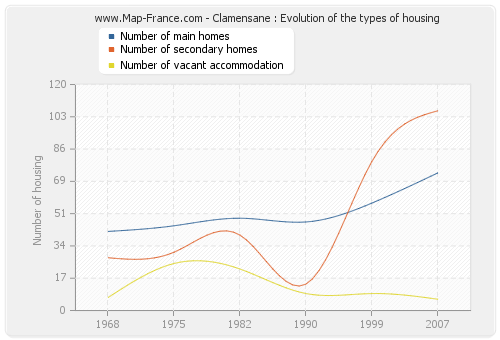 The following graphs show the history of the number and the type of housing of Clamensane from 1968 to 2007. The second graph is drawn in cubic interpolation. This allows to obtain more exactly the number of accommodation of the town of Clamensane years where no inventory was made.