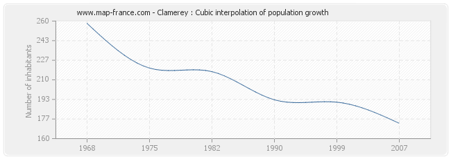 This curve shows the history of the population of Clamerey from 1968 to 2007 in cubic interpolation. This provides more precisely the population of the municipality of Clamerey the years where no census has been taken.