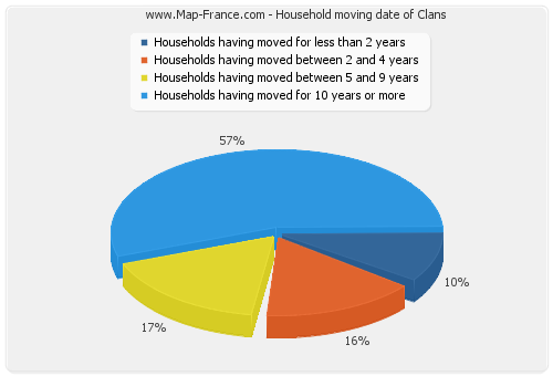 In 2007, 182 main homes of Clans were occupied by owners. Meanwhile, 246 households lived in the town of Clans. The following graphs present the statistics of these households of Clans.