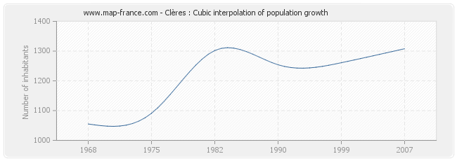 This curve shows the history of the population of Clères from 1968 to 2007 in cubic interpolation. This provides more precisely the population of the municipality of Clères the years where no census has been taken.