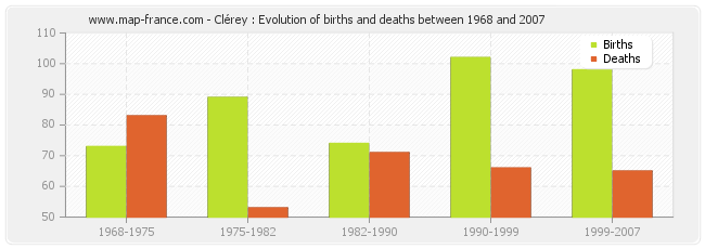 Population of Clérey was 1 104 inhabitants in 2007, 929 inhabitants in 1999, 865 inhabitants in 1990, 825 inhabitants in 1982, 788 inhabitants in 1975 and 802 inhabitants in 1968.