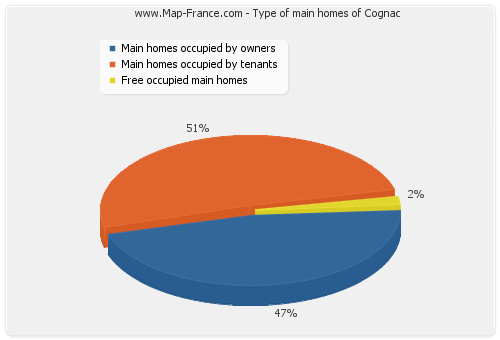 - Number of main homes of Cognac occupied by owners : 4 520 - Number of main homes of Cognac occupied by tenants : 4 950 - Number of main homes of Cognac occupied free of charge : 184 |