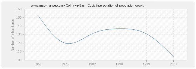 Population of Coiffy-le-Bas was 104 inhabitants in 2007, 131 inhabitants in 1999, 137 inhabitants in 1990, 131 inhabitants in 1982, 120 inhabitants in 1975 and 153 inhabitants in 1968.
