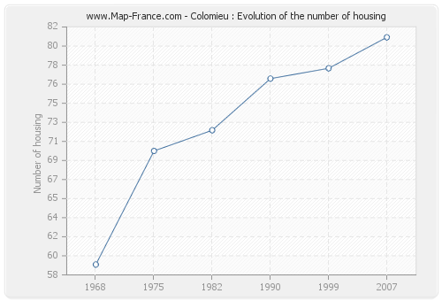 The number of housing of Colomieu was 81 in 2007, 78 in 1999, 77 in 1990, 72 in 1982, 70 in 1975 and 59 in 1968.