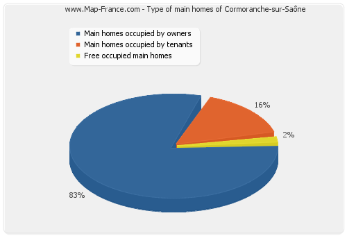 - Number of main homes of Cormoranche-sur-Saône occupied by owners : 325 - Number of main homes of Cormoranche-sur-Saône occupied by tenants : 61 - Number of main homes of Cormoranche-sur-Saône occupied free of charge : 7 |