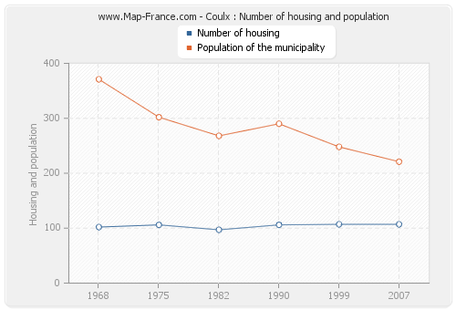 The population of Coulx was 221 inhabitants in 2007, 248 inhabitants in 1999, 290 inhabitants in 1990, 268 inhabitants in 1982, 302 inhabitants in 1975 and 371 inhabitants in 1968. Meanwhile, the number of housing of Coulx was 107 in 2007, 107 in 1999, 106 in 1990, 97 in 1982, 106 in 1975 and 102 in 1968.