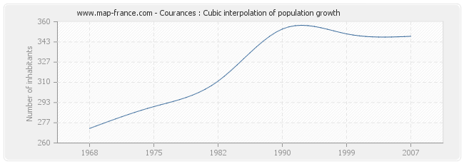 This curve shows the history of the population of Courances from 1968 to 2007 in cubic interpolation. This provides more precisely the population of the municipality of Courances the years where no census has been taken.