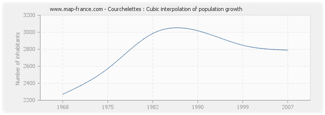 Population of Courchelettes was 2 790 inhabitants in 2007, 2 847 inhabitants in 1999, 3 018 inhabitants in 1990, 2 986 inhabitants in 1982, 2 572 inhabitants in 1975 and 2 270 inhabitants in 1968.