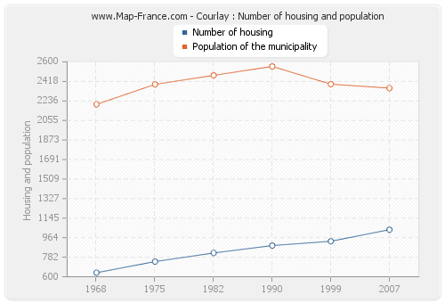 The population of Courlay was 2 356 inhabitants in 2007, 2 393 inhabitants in 1999, 2 558 inhabitants in 1990, 2 475 inhabitants in 1982, 2 391 inhabitants in 1975 and 2 205 inhabitants in 1968. Meanwhile, the number of housing of Courlay was 1 038 in 2007, 930 in 1999, 890 in 1990, 821 in 1982, 741 in 1975 and 637 in 1968.