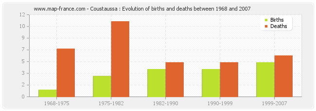 Coustaussa : evolution of births and deaths from 1968 to 2007
