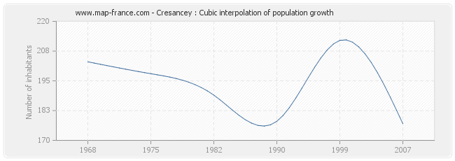 This curve shows the history of the population of Cresancey from 1968 to 2007 in cubic interpolation. This provides more precisely the population of the municipality of Cresancey the years where no census has been taken.