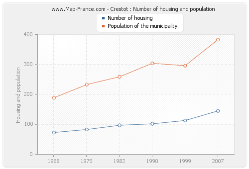The population of Crestot was 383 inhabitants in 2007, 296 inhabitants in 1999, 304 inhabitants in 1990, 259 inhabitants in 1982, 233 inhabitants in 1975 and 189 inhabitants in 1968. Meanwhile, the number of housing of Crestot was 145 in 2007, 113 in 1999, 102 in 1990, 97 in 1982, 83 in 1975 and 73 in 1968.