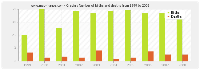 - Crevin in 2008 : 44 births and 6 deaths