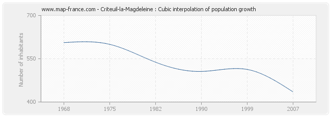 This curve shows the history of the population of Criteuil-la-Magdeleine from 1968 to 2007 in cubic interpolation. This provides more precisely the population of the municipality of Criteuil-la-Magdeleine the years where no census has been taken.