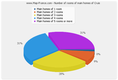 - Number of main homes of Cruis of 1 room : 1 - Number of main homes of Cruis of 2 rooms : 25 - Number of main homes of Cruis of 3 rooms : 77 - Number of main homes of Cruis of 4 rooms : 77 - Number of main homes of Cruis of 5 rooms and more : 84 |
