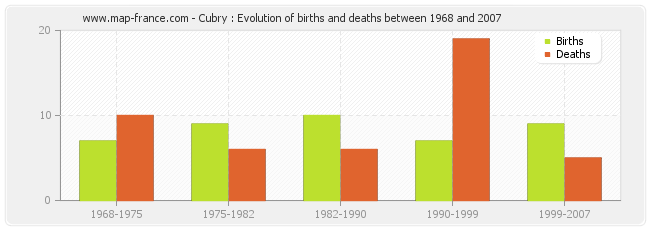 Population of Cubry was 75 inhabitants in 2007, 70 inhabitants in 1999, 105 inhabitants in 1990, 106 inhabitants in 1982, 82 inhabitants in 1975 and 96 inhabitants in 1968.