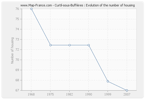 The population of Curtil-sous-Buffières was 78 inhabitants in 2007, 79 inhabitants in 1999, 73 inhabitants in 1990, 78 inhabitants in 1982, 100 inhabitants in 1975 and 104 inhabitants in 1968. Meanwhile, the number of housing of Curtil-sous-Buffières was 67 in 2007, 68 in 1999, 72 in 1990, 72 in 1982, 72 in 1975 and 76 in 1968.