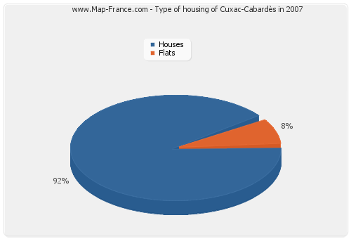 The following graphs show the history of the number and the type of housing of Cuxac-Cabardès from 1968 to 2007. The second graph is drawn in cubic interpolation. This allows to obtain more exactly the number of accommodation of the town of Cuxac-Cabardès years where no inventory was made.