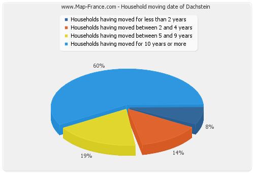 - Number of households of Dachstein having moved between 2 and 5 years : 75 - Number of households of Dachstein having moved between 5 and 9 years : 101 - Number of households of Dachstein having moved for 10 years or more : 325 |